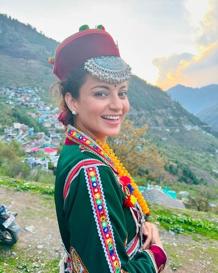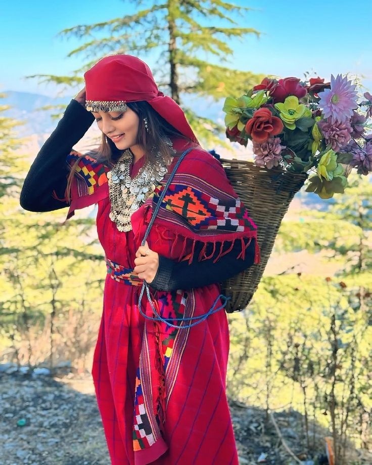 The Kullu Valley, known for its snow, orchards, and vibrant festivals, is equally famous for its textiles. Women wear the Pattu, a hand-woven woollen wrap worn much like a saree but pinned at the shoulders with ornate silver clasps called Brok. Beneath it, a blouse and skirt or salwar are worn. The look is completed with a colorful Thipu (woollen headscarf) and Pullan (grass or woollen shoes).